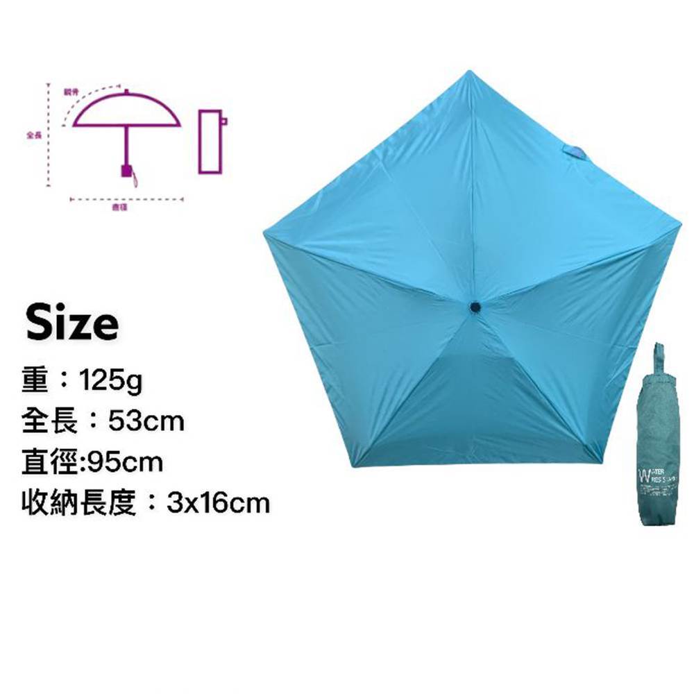 超潑水納米傘布五縮半徑21吋5骨125g特輕碳纖防風骨手開傘 超迷你16cm口袋短傘摺疊後只有16cm 長, 方便放在口袋或小手袋滴水不沾雨傘! 採用最新高潑水力的台灣福懋傘布,能瞬間抖掉水珠,雨傘使用後只需開收震動, 傘面就不會有水漬,上車入室內不再濕答答!輕量,只有125G極至纖薄,摺疊後只有16 X3 CM打開直徑約95CM輕盈卻異常強壯!使用碳纖製做的傘骨,防風又輕身免摺傘款, 打開方便有深藍, 湖水綠, 墨綠, 黑色